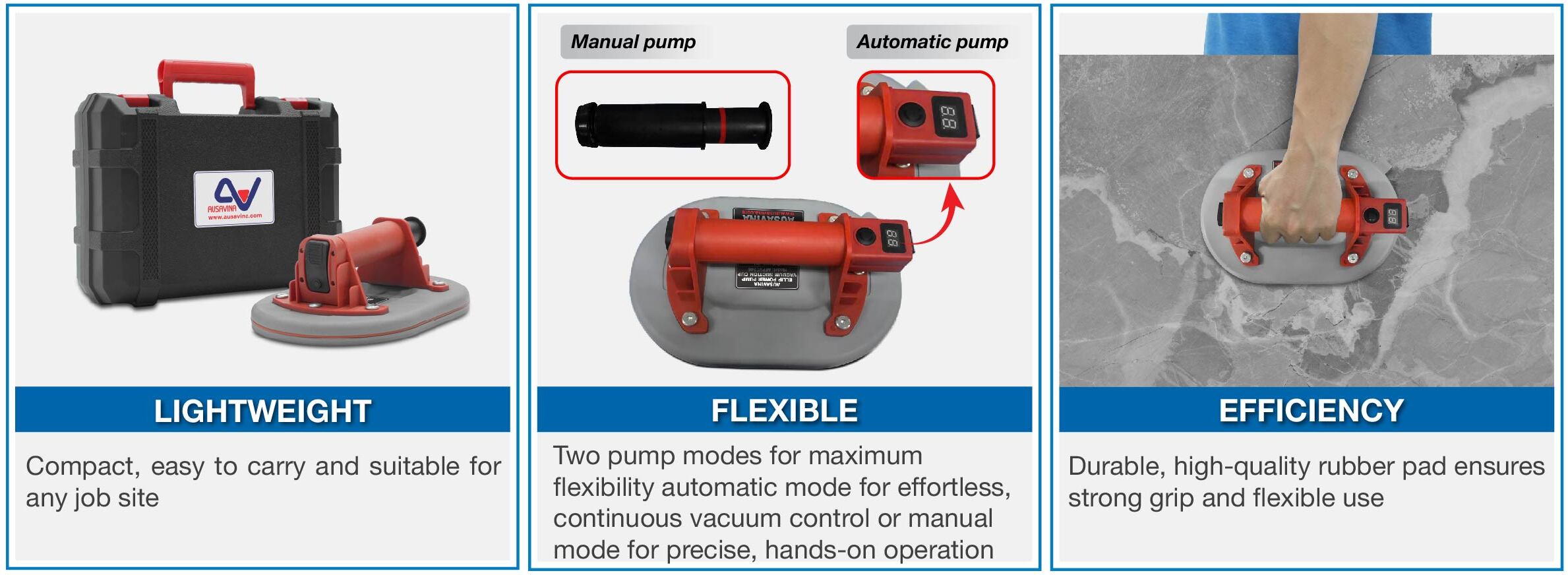 Ausavina Ellip Power Pump Vacuum Suction Cup is a specialized tool designed for handling stone slabs, glass sheets, or any material with a flat surface. It is ideal for workshops, fabrication facilities, and public construction sites.