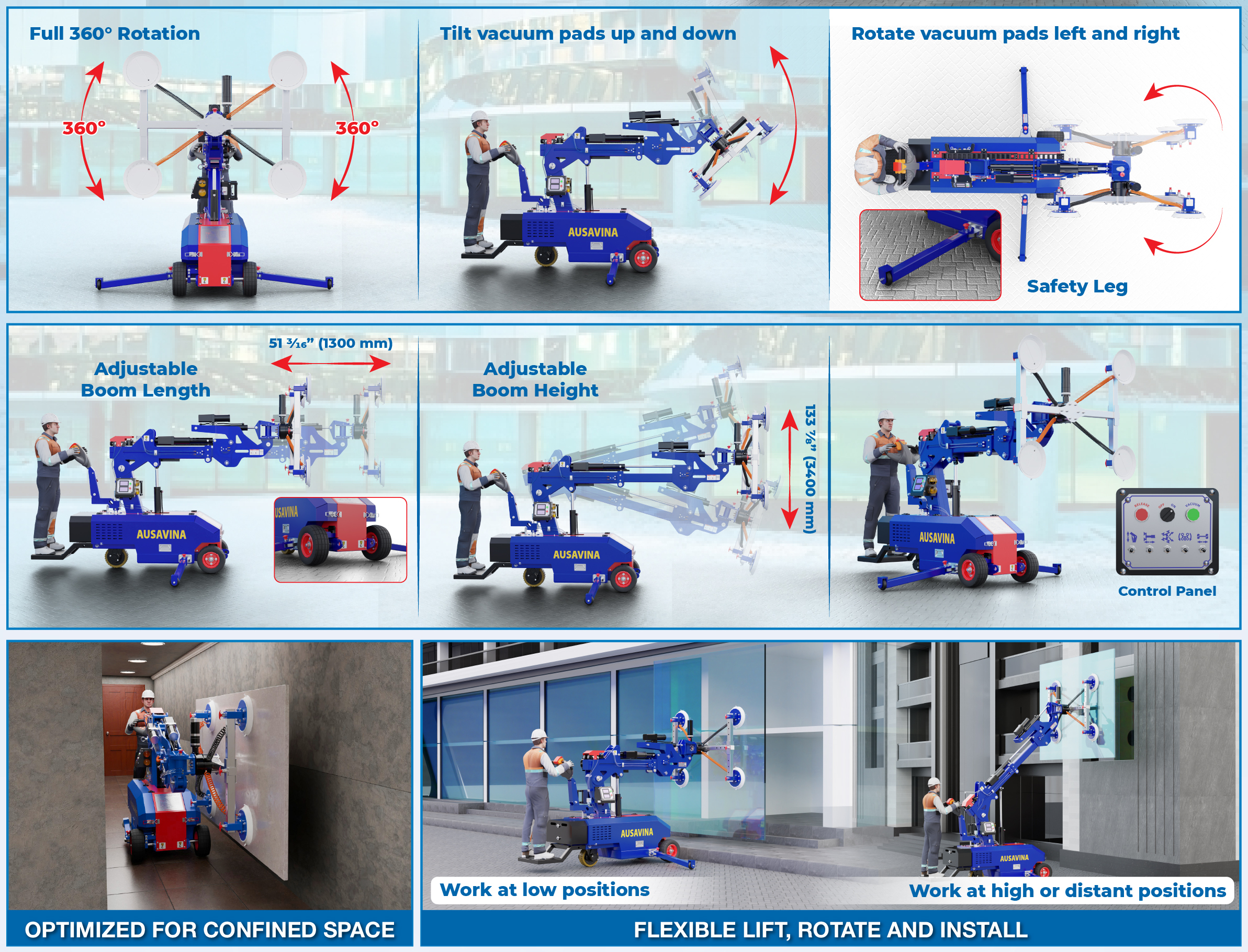 - 360° continuous rotation allows flexible handling of panel and smooth, precise maneuverability in confined spaces, whether positioned on A-Frames or the ground.