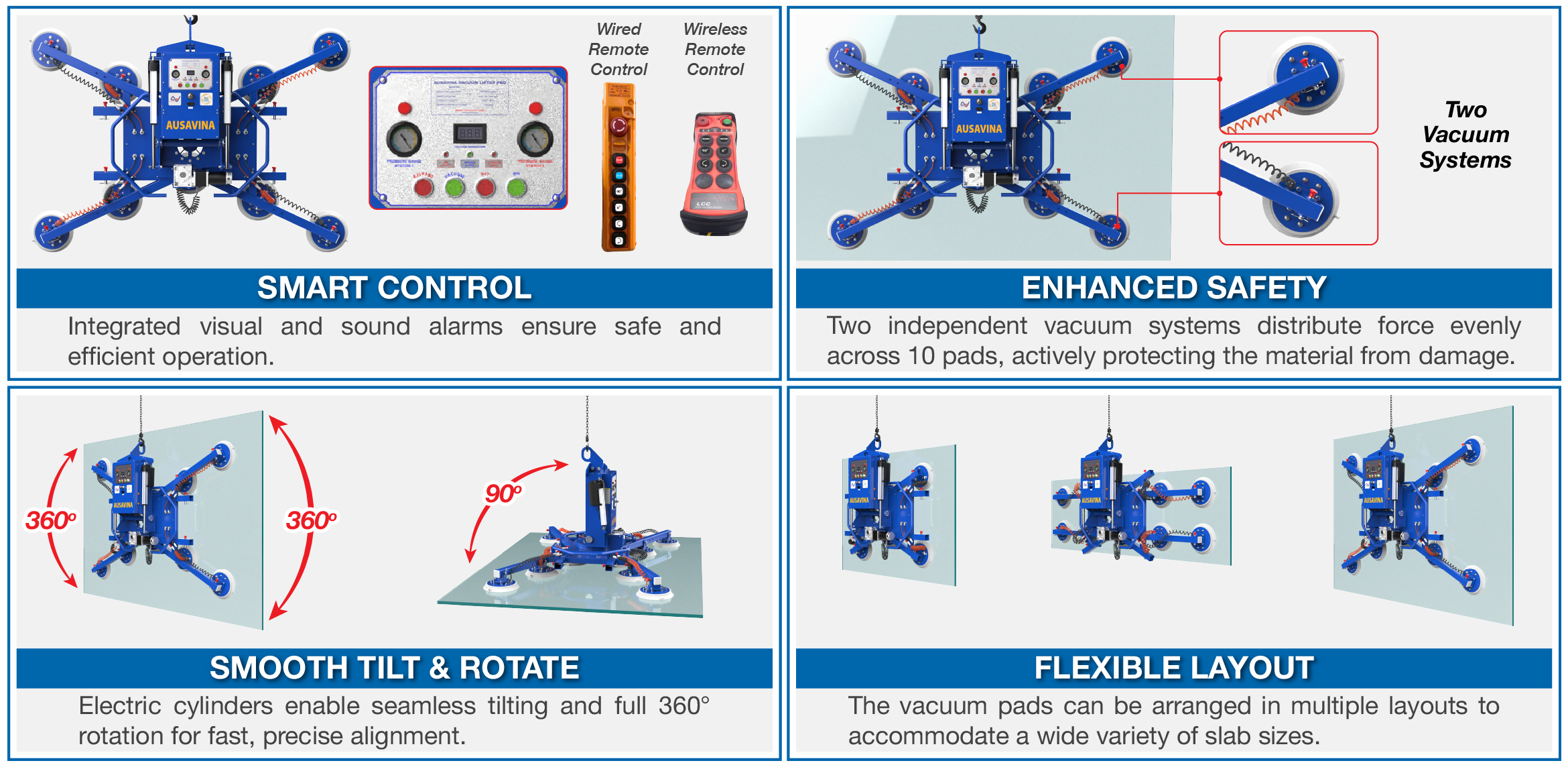 • Equipped with 10 vacuum pads that evenly distribute suction force to securely hold thin or fragile slab.