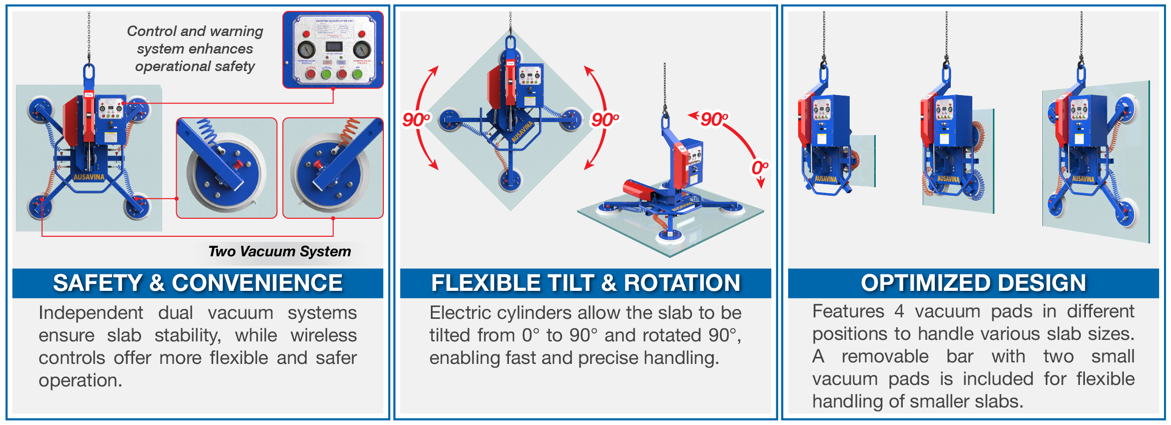 Ausavina Vacuum Lifter Pro offers an optimal solution for lifting, moving, and installing slabs. Its flexible operation, enhanced safety and superior performance meet the highest demands of professional slab handling projects.