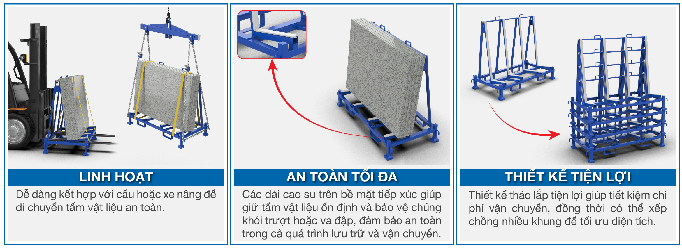 Khung Dựng Tấm Đá với thiết kế cải tiến mang lại hiệu quả cao trong việc lưu trữ vật liệu.