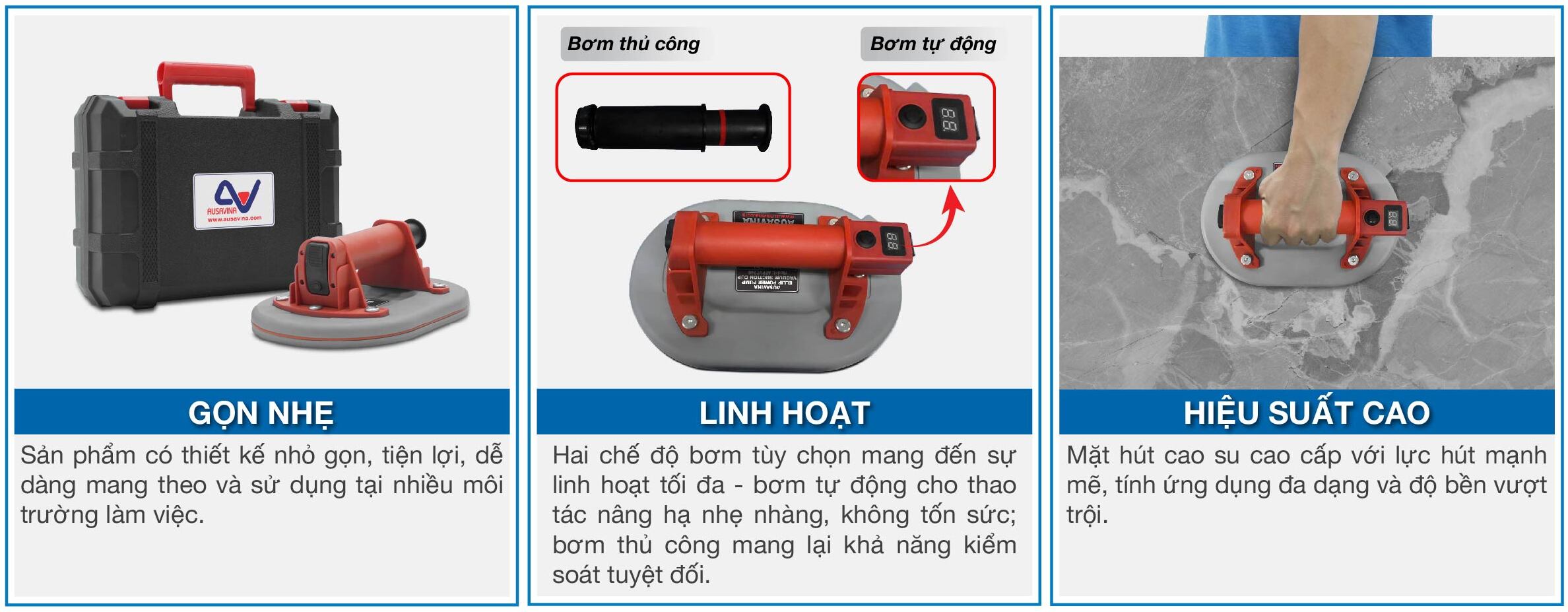 - Dế dàng nâng và di chuyển nhiều loại vật liệu có bề mặt phẳng như đá, kính, kim loại, nhựa,...